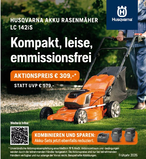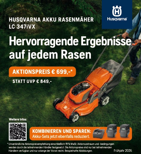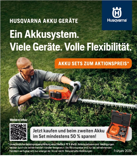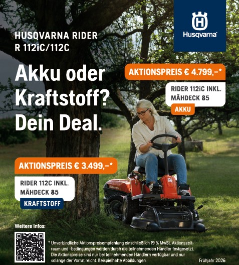 Zwei starke Lösungen für jeden Anspruch Mit den Husqvarna Ridern R 112iC (Akku) und R 112C (Benzin) bietet Husqvarna zwei leistungsstarke Aufsitzmäher für private Grundstücke und anspruchsvolle Gartenbesitzer. Beide Modelle überzeugen durch ihre Wendigkeit, Effizienz und den bewährten Husqvarna Frontmähdeck-Antrieb. Im Rahmen der aktuellen Frühjahrsaktion sind die Rider zu attraktiven Aktionspreisen erhältlich. Ganz gleich, ob…
